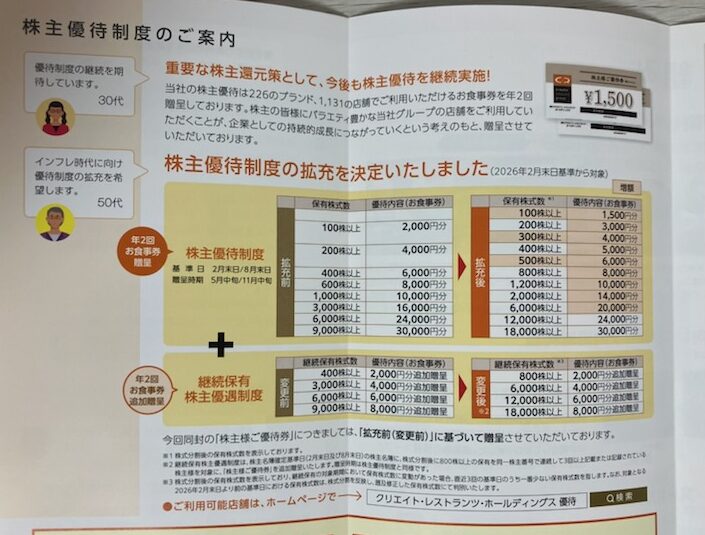 となっています。株主優待は100株からで、そこから18,000株まで段階的に頂ける優待食事券の額が1,500円から30,000円まで段階的に増えていきます。また1年以上継続保有の場合、800株から追加で優待食事券がいただけます!