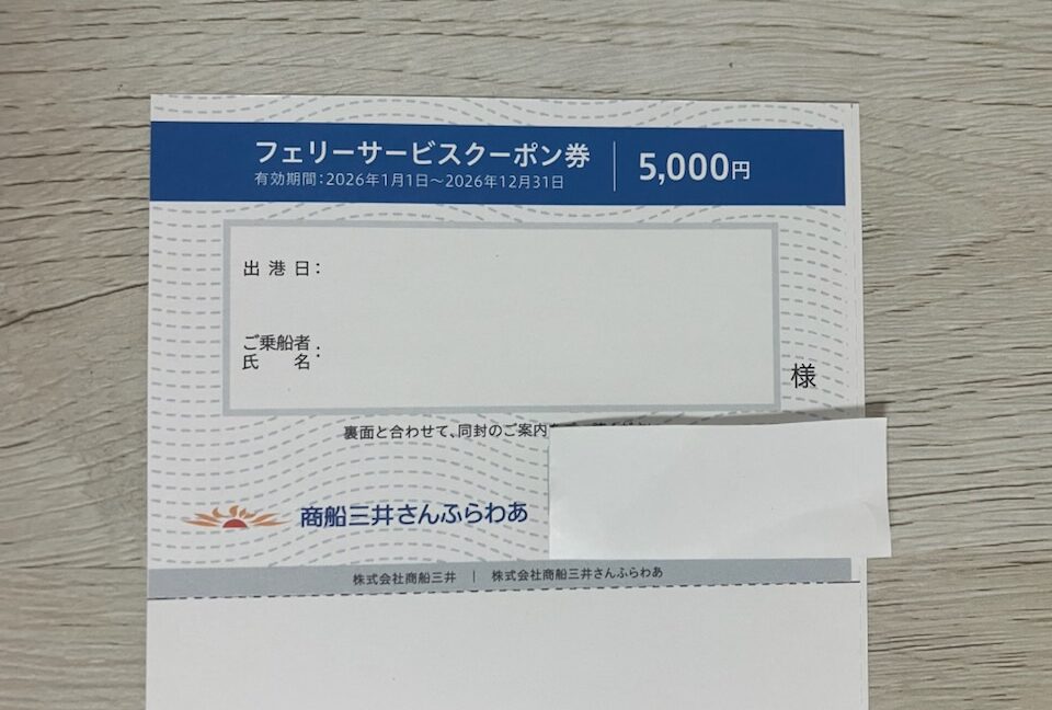 これは!庶民にはクルーズ優待券より使う機会の多い優待券ですね。商船三井さんふらわのフェリーで使用できる5,000円分のクーポン券です!